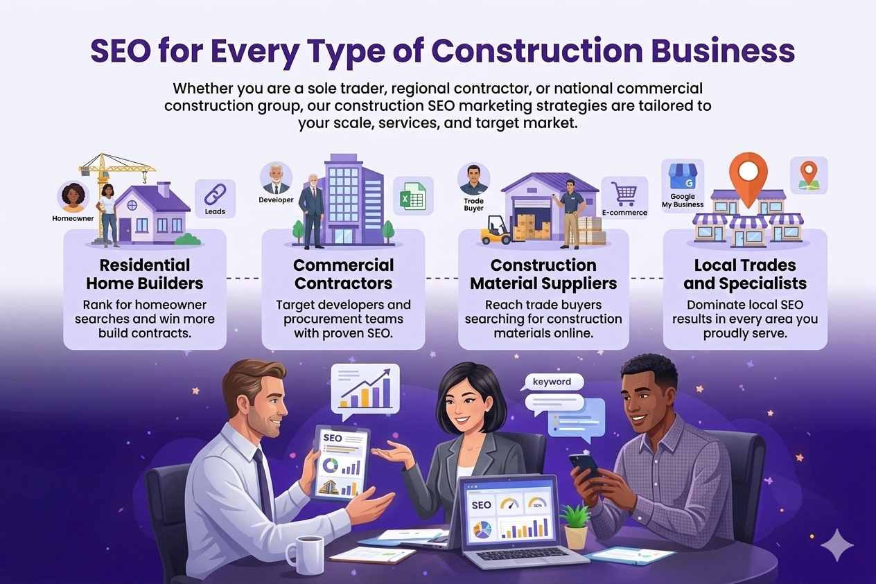 Whether you are a sole trader, regional contractor, or national commercial construction group, our construction SEO marketing strategies are tailored to your scale, services, and target market.