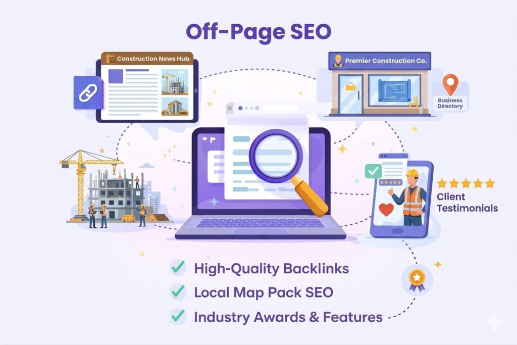 - Internal linking structure built to pass authority across your construction website