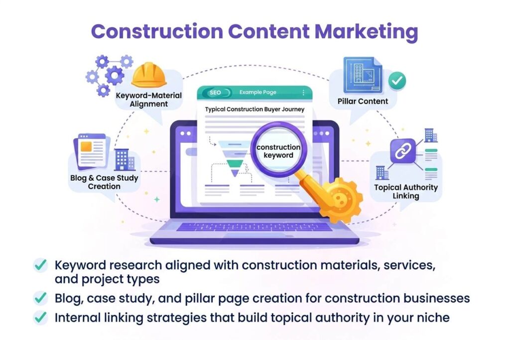 - Blog, case study, and pillar page creation for construction businesses